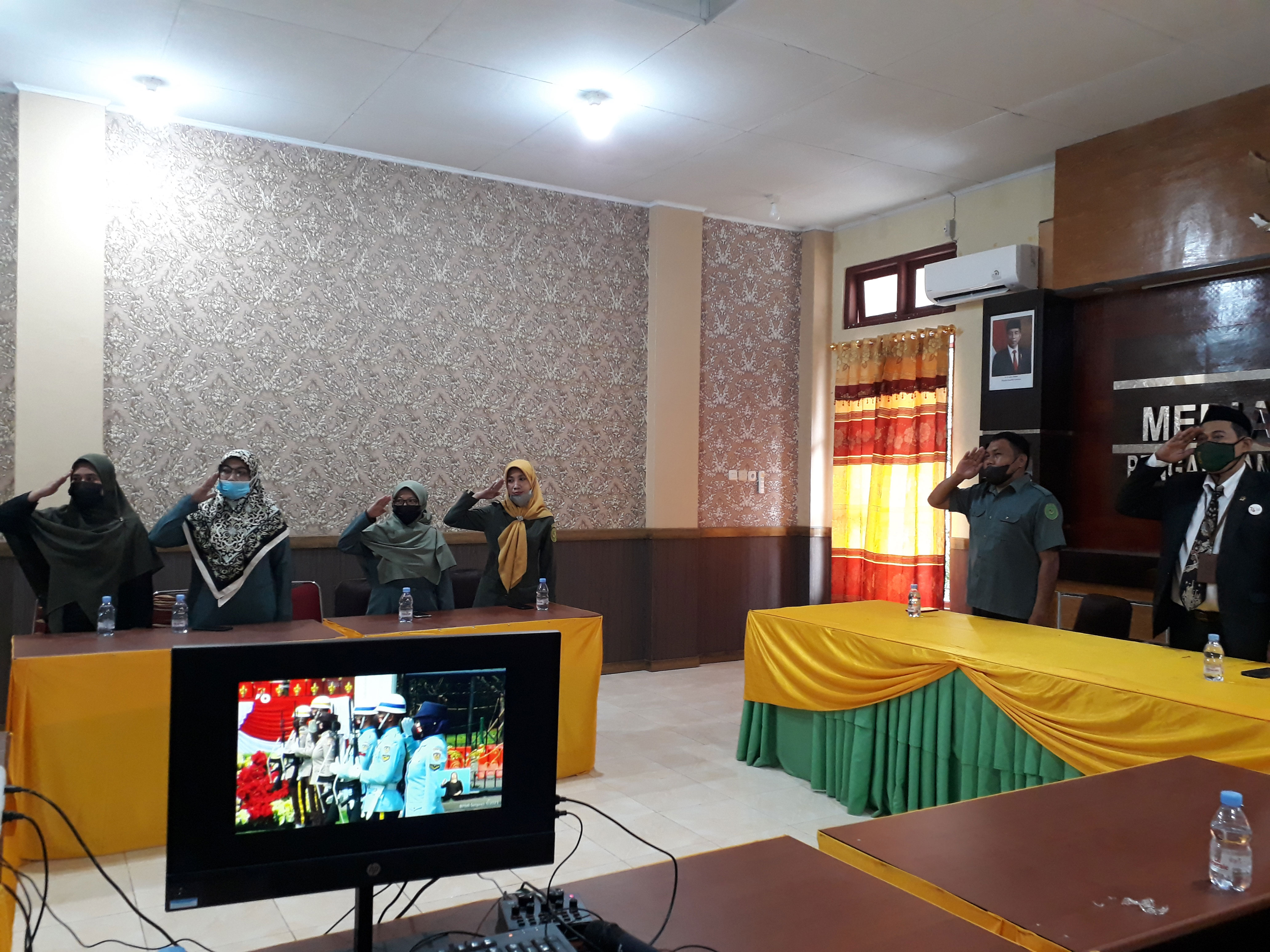 4. Pukul 11:00 WITA di Ruang Media Center Pengadilan Agama Selayar, Ketua Pengadilan Agama Selayar, H. Adam Malik B, S.H.I., bersama segenap PPNPN Pengadilan Agama Selayar mengikuti secara daring Upacara Detik-Detik Proklamasi Kemerdekaan RI dan Pengibaran Bendera Merah Putih dari Istana Merdeka.