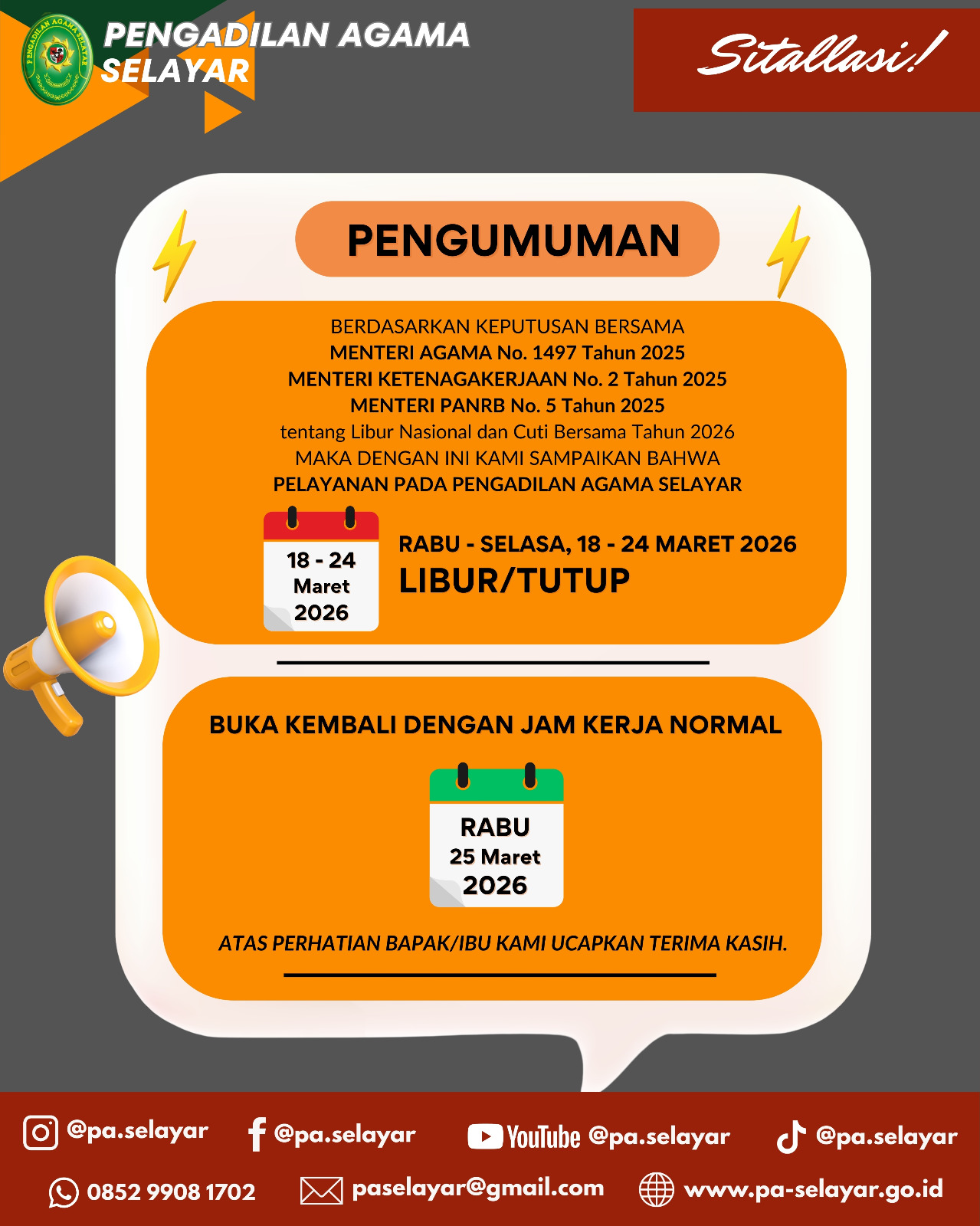 PENGUMUMAN JAM PELAYANAN KANTOR PENGADILAN AGAMA SELAYAR SELAMA LIBUR DAN CUTI BERSAMA