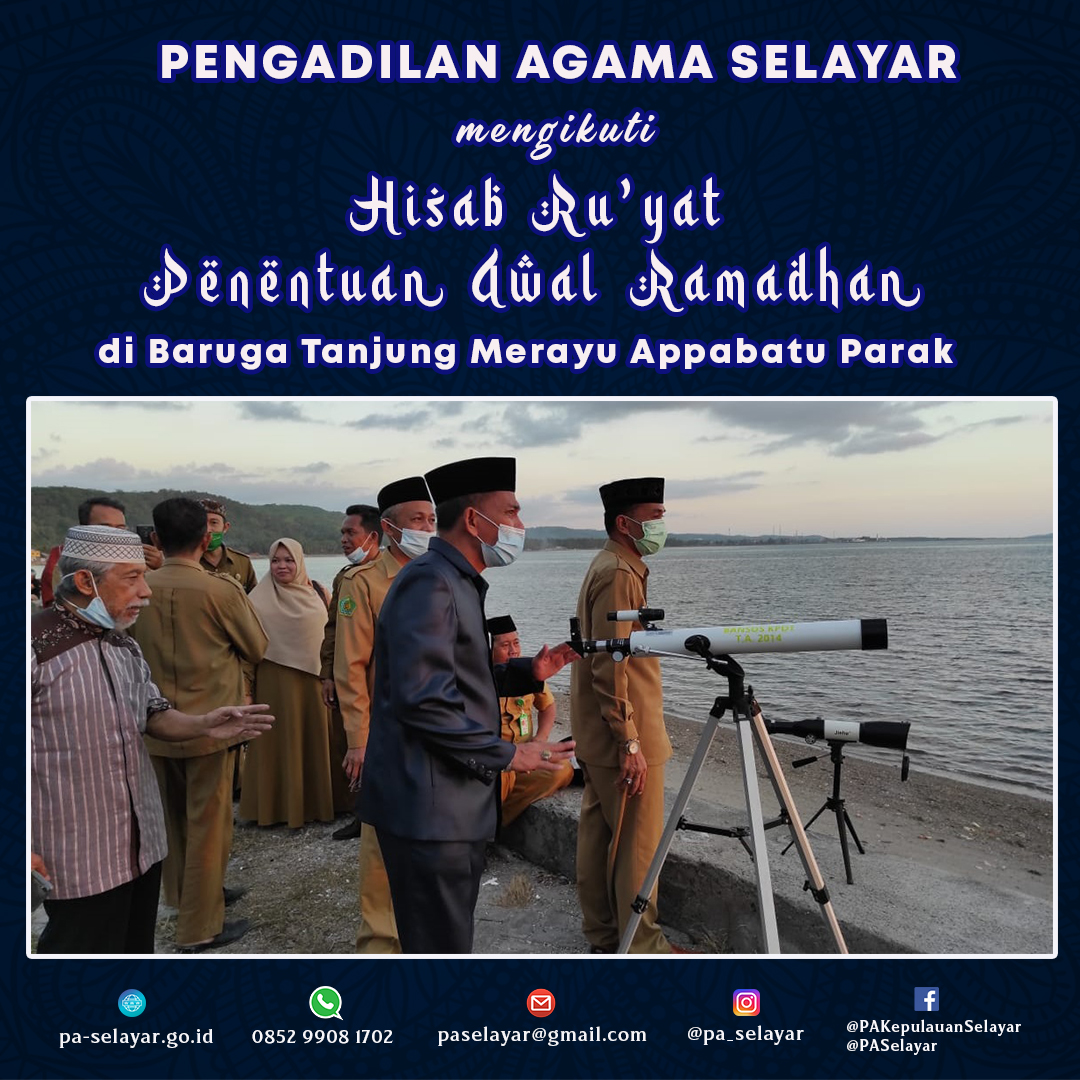 Di penghujung senja Senin, 12 April 2021, Pengadilan Agama Selayar beserta Ketua Majelis Ulama Indonesia (MUI) Selayar, Pimpinan Pengurus Ormas Kab. Kepulauan Selayar, Kasubag Tata Usaha, Kepala Seksi dan Penyelenggara, dan segenap Ketua Kantor Urusan Agama (KUA) di Kab. Kepulauan Selayar menyelenggarakan Ru'yatul Hilal Penetapan Awal Bulan Suci Ramadhan di tepian Pantai Baruga Tanjung Merayu Appabatu Parak Kab. Kepulauan Selayar.
